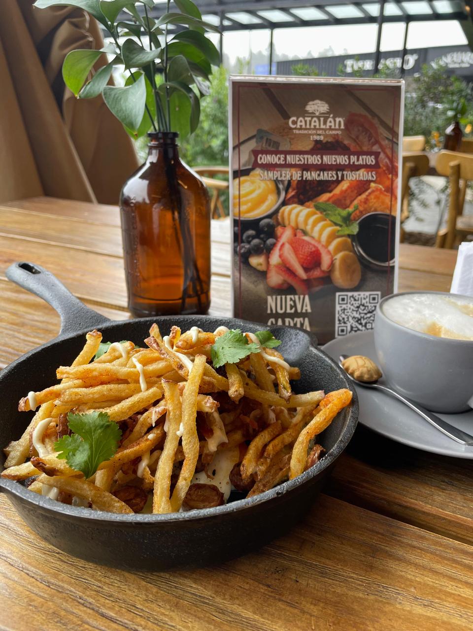 Huevos fritos en aceite de oliva con salchicha desayuno CATALÁN, chorizo antioqueño y tocineta crocante. Papas a la francesa con mayo de ajo y trufa.