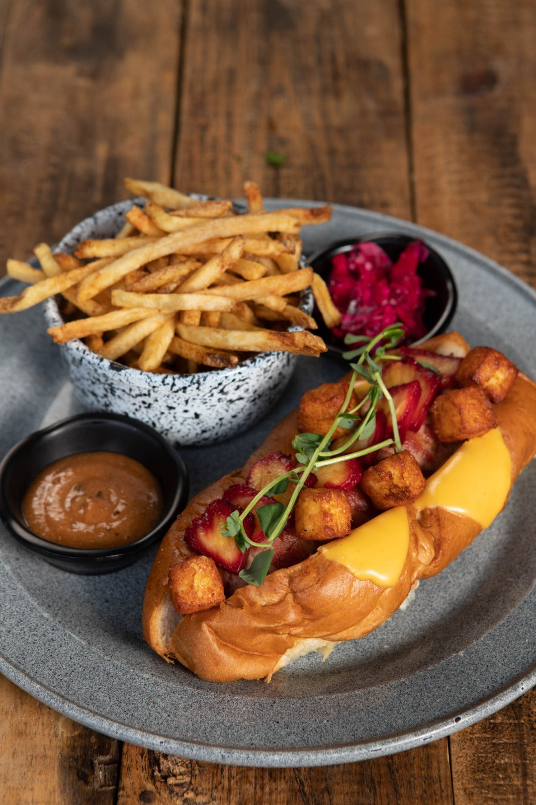 Salchicha berlinesa CATALÁN de 90gr, envuelta en tocineta, queso americano, piña asada, queso costeño frito y mostaza