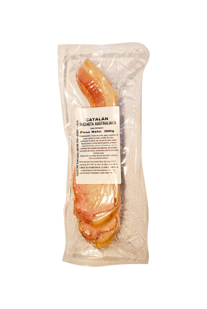 Ingredientes: carne de cerdo, agua, regulador de acidez (lactato de sodio, acetato de sodio, fosfatos de sodio), extracto de levadura, sal, azúcar, fijador de color (nitrito de sodio), sabor natural a humo, antioxidante (eritorbato de sodio).